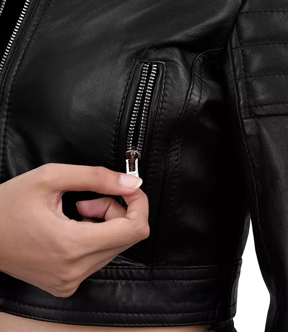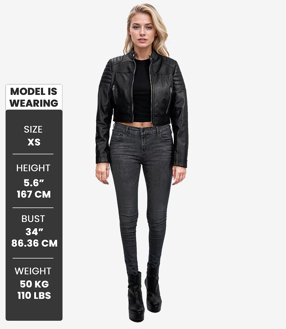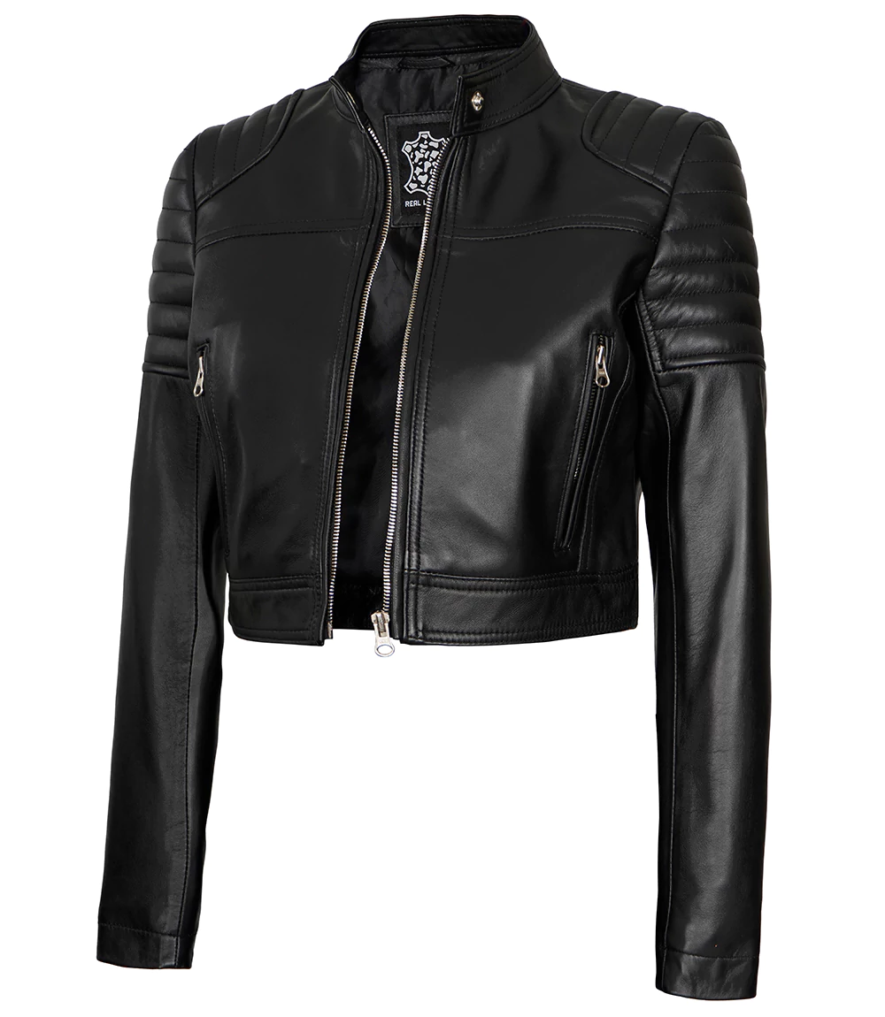 Dive into the world of contemporary fashion with the Womens Black Cropped Leather Moto Jacket. Designed for the modern woman who values both style and comfort, this jacket combines the classic appeal of leather with a trendy cropped silhouette.