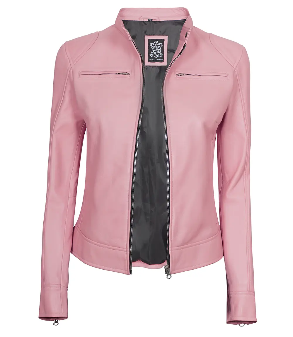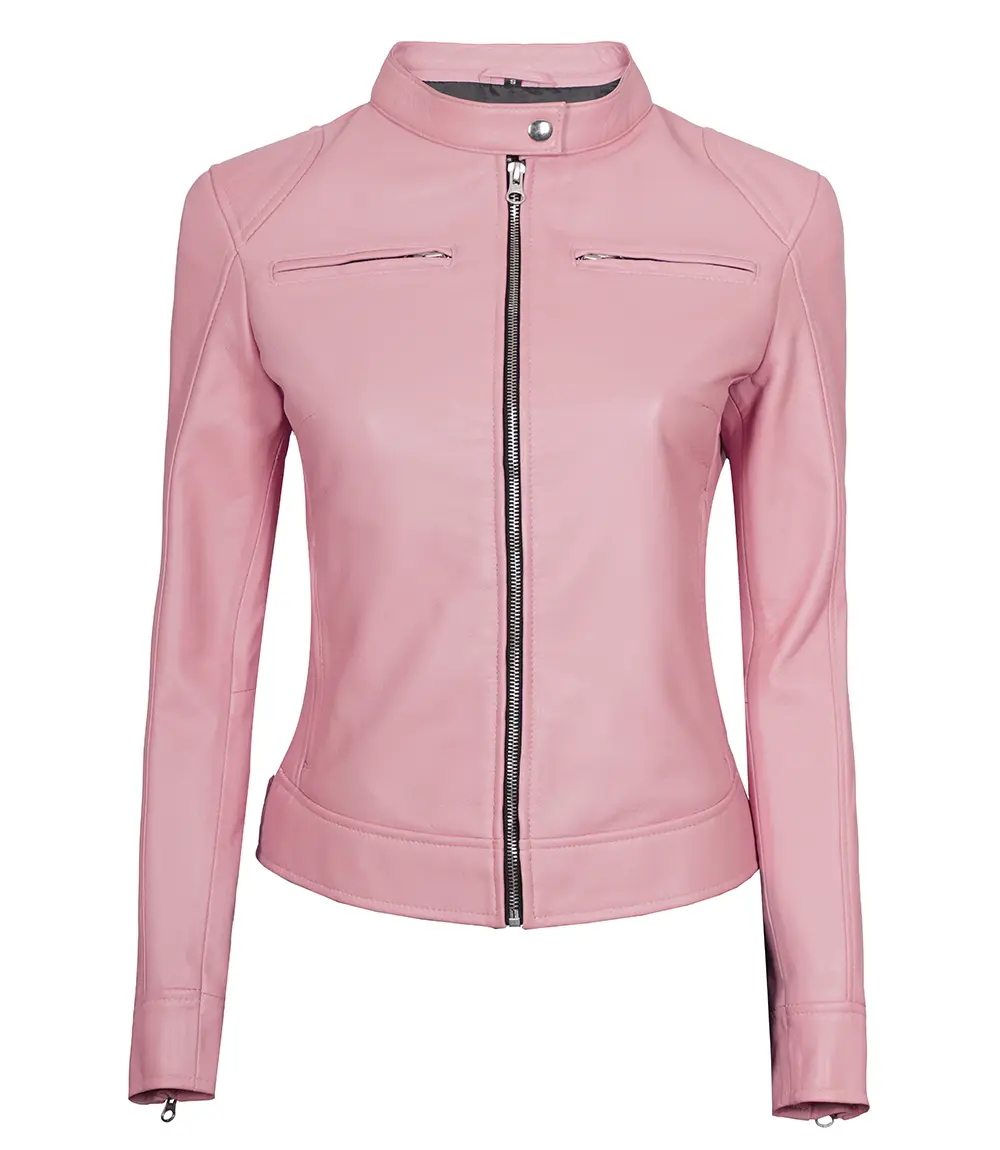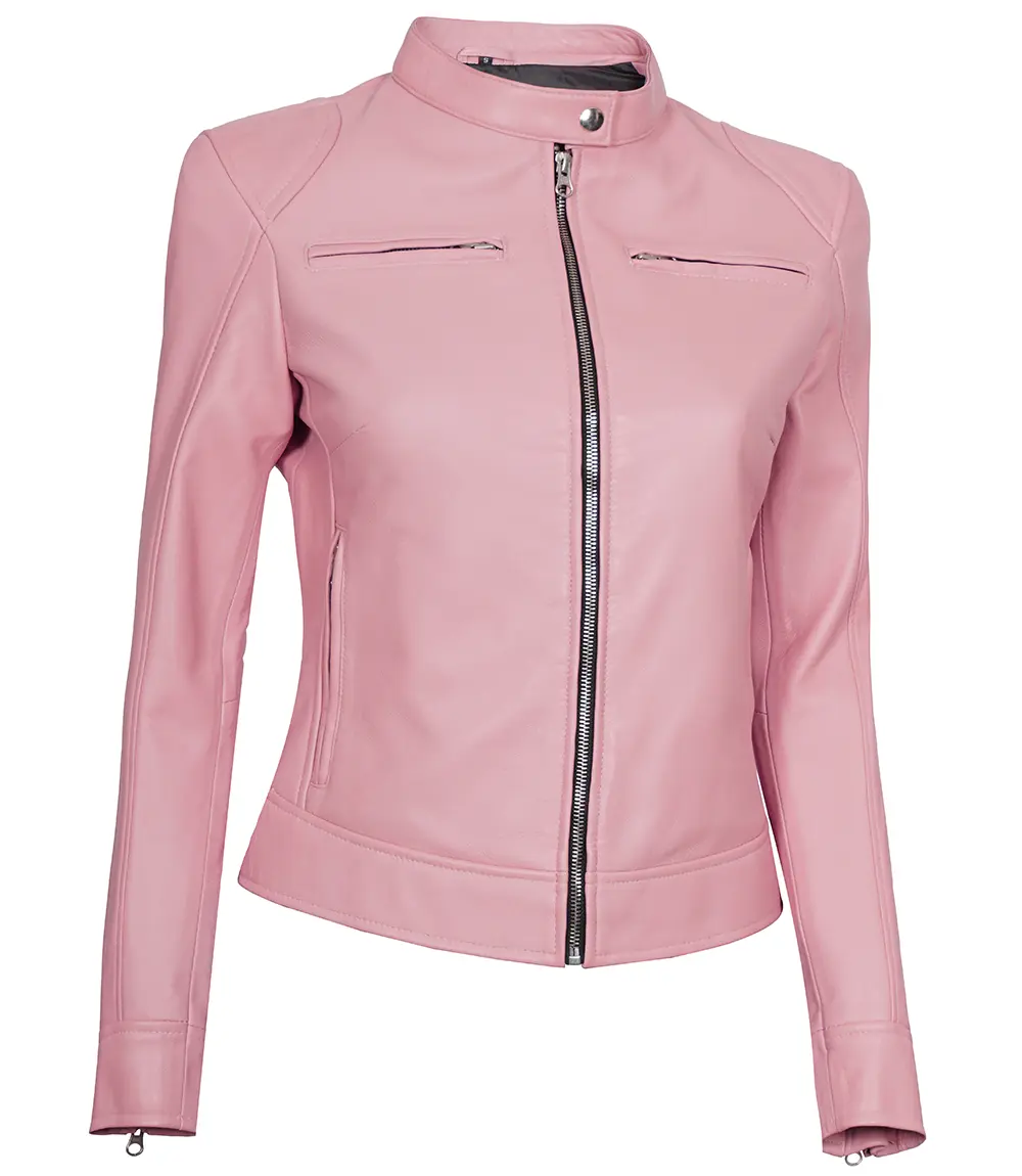 Redefine your style with our Women's Light Pink Motorcycle Cafe Racer Leather Jacket. A fusion of bold and essential function, this jacket is crafted for the modern female.