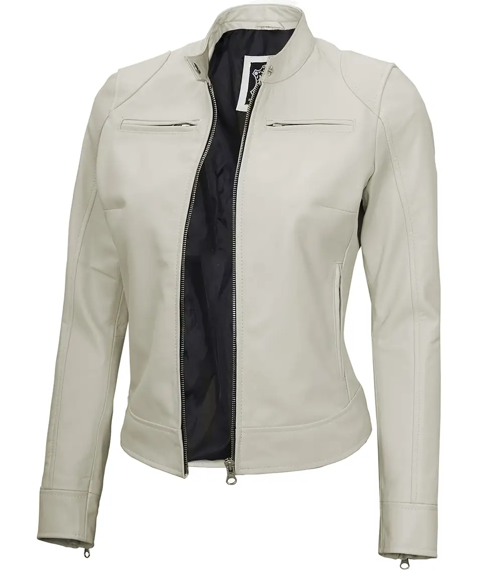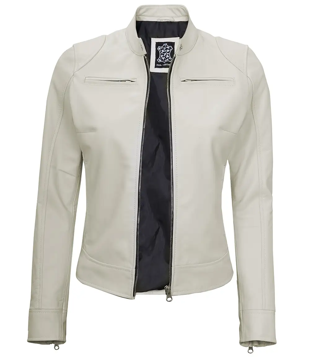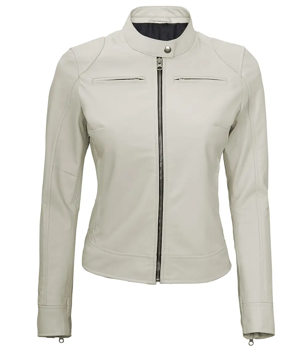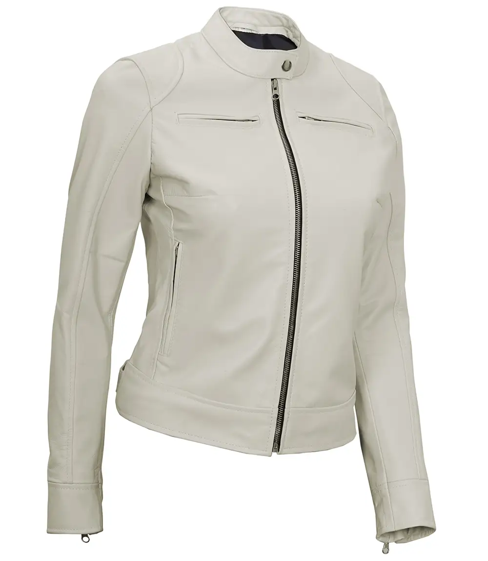Off White Leather Motorcycle Cafe Racer Jacket for Women